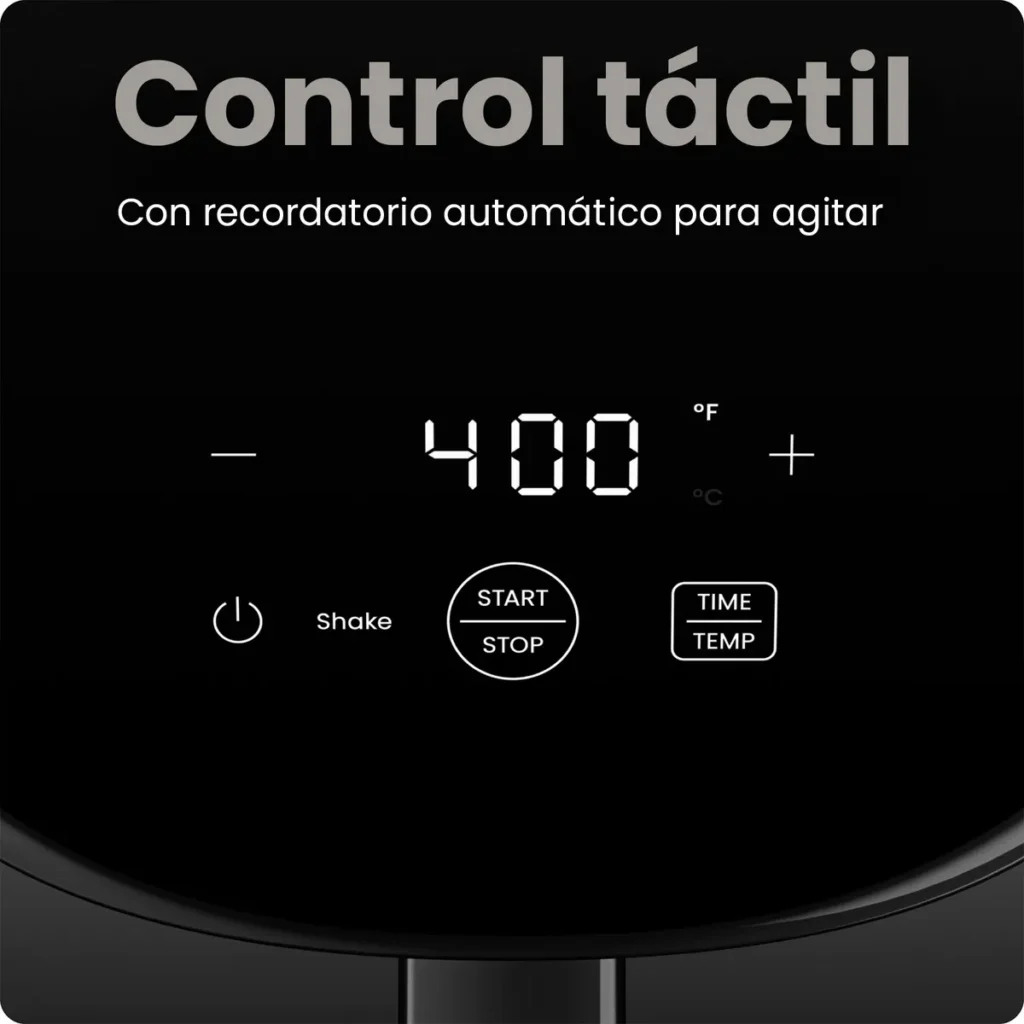 - Puede freír de 200°F a 400 °F, por lo que cocinarás fácil, rápido y con textura crujiente a la mitad de tiempo que en un horno tradicional.